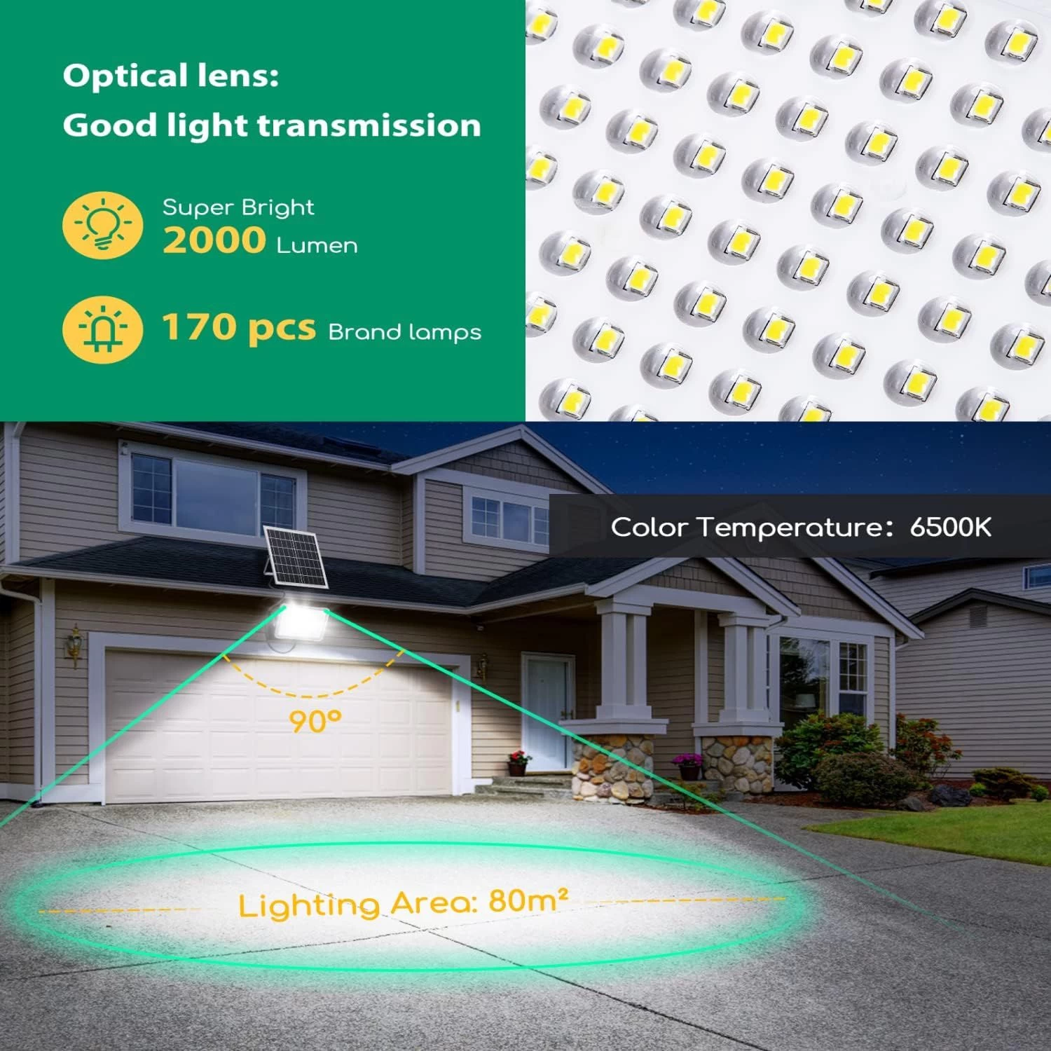 【iluminación con mucho brillo】el foco solar aigostar está equipado con 170 led lumínicos y una lente óptica, por lo que la pérdida de eficiencia de la luz se reduce al mínimo, proporcionando 2000 lúmenes y una distancia de iluminación de hasta 10 m., todo esto sin incrementar la factura de la luz. La mejor opción para iluminar jardines, caminos, garajes o cualquier punto exterior.【panel solar de alta eficacia 】el panel solar fotoeléctrico aigostar tiene una conversión de alta eficiencia que puede convertir hasta el 25 % de la energía solar en energía eléctrica. Su batería recargable lifepo4 es de 3,2 v, 20.000 mah, y proporciona entre 8 y 12 horas de funcionamiento continuo si está completamente cargada. Ofrece 20.000 horas de iluminación y una batería con una larga vida útil.【mando a distancia incluido】el proyector led solar dispone de un mando a distancia con 10 metros de alcance con el que puede ajustar el brillo y elegir el modo de funcionamiento (modo puesta de sol y modo de detección de movimiento). Además, también se puede configurar la función de temporizador para apagarlo en 3 h./5 h./8 h.【modo puesta de sol y modo sensor de movimiento】esta luz solar dispone de dos modos de uso: modo 1(modo puesta de sol): pulse «auto», el foco solar se encenderá automáticamente por la noche y se apagará durante el día. (nota: el foco dispone de encendido automático al anochecer y esta función no podrá ser desactivada)modo 2 (modo sensor de movimiento): pulse “m”, se encenderá automáticamente al 100 % de brillo cuando se acerque alguien.【resistente al agua protección ip65 y fácil de instalar】 el foco aigostar está hecho de materiales duraderos y es resistente al agua con protección ip65. Está equipado con rosca y 1,2 m de cable. Debe montar el foco solar led en lugares donde haya luz solar directa y ajustar el soporte para conseguir el mayor tiempo de iluminación posible.