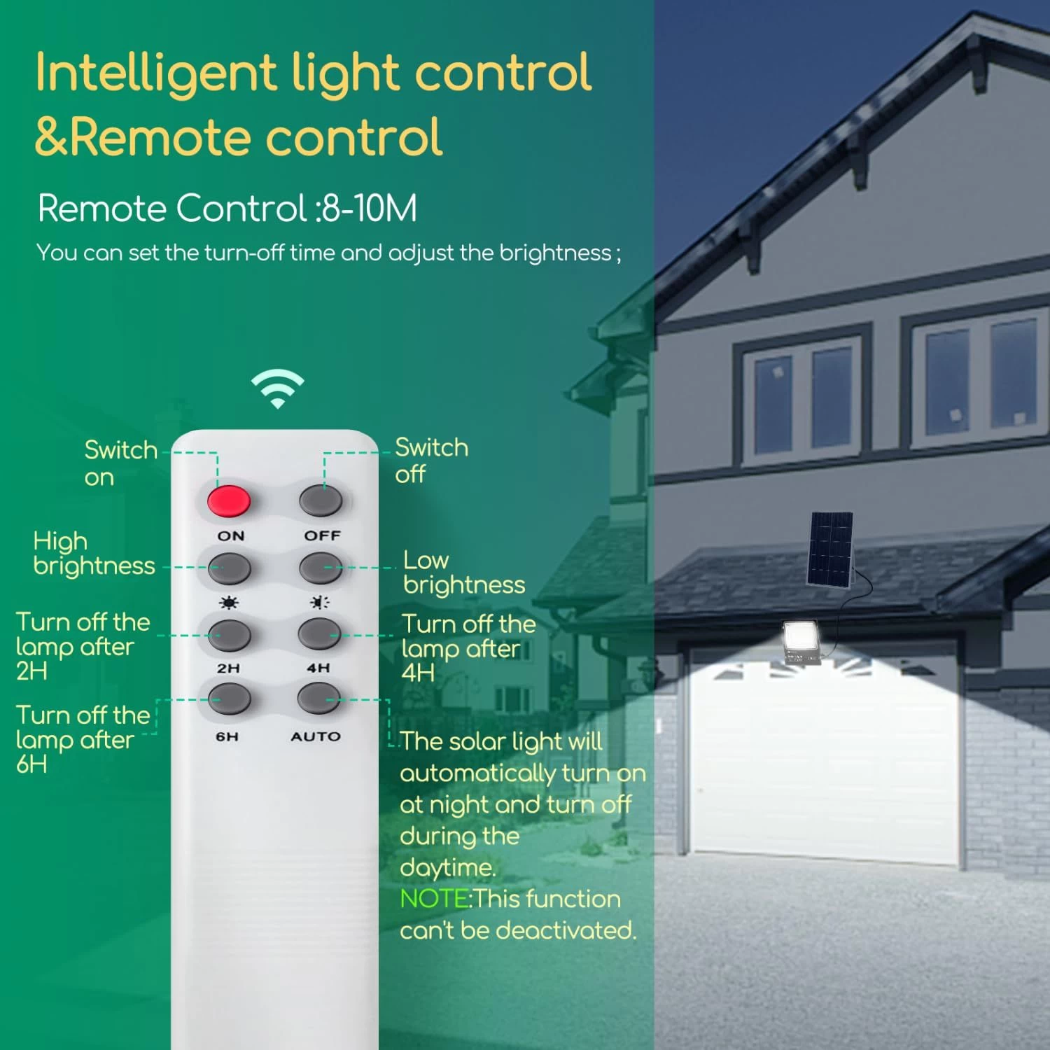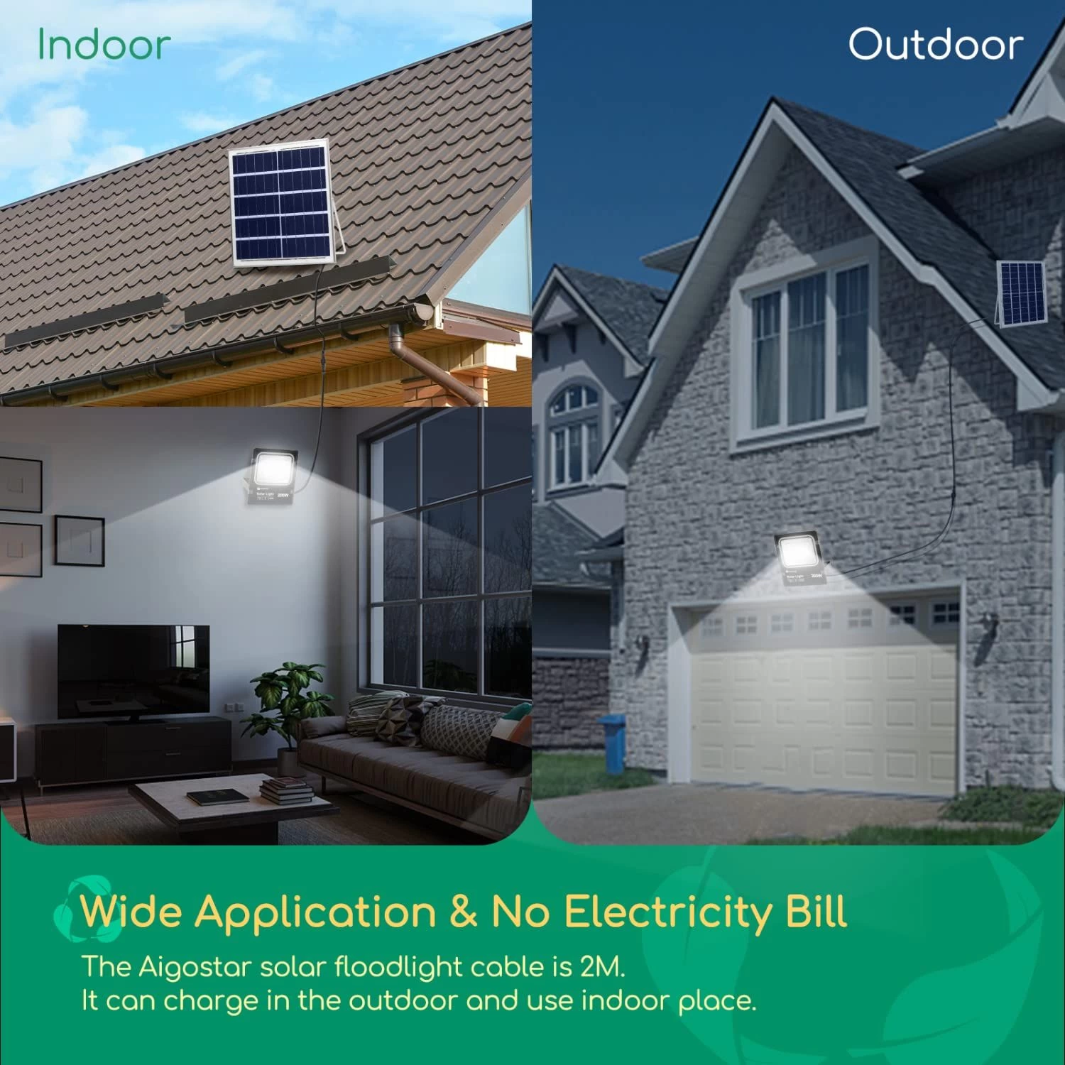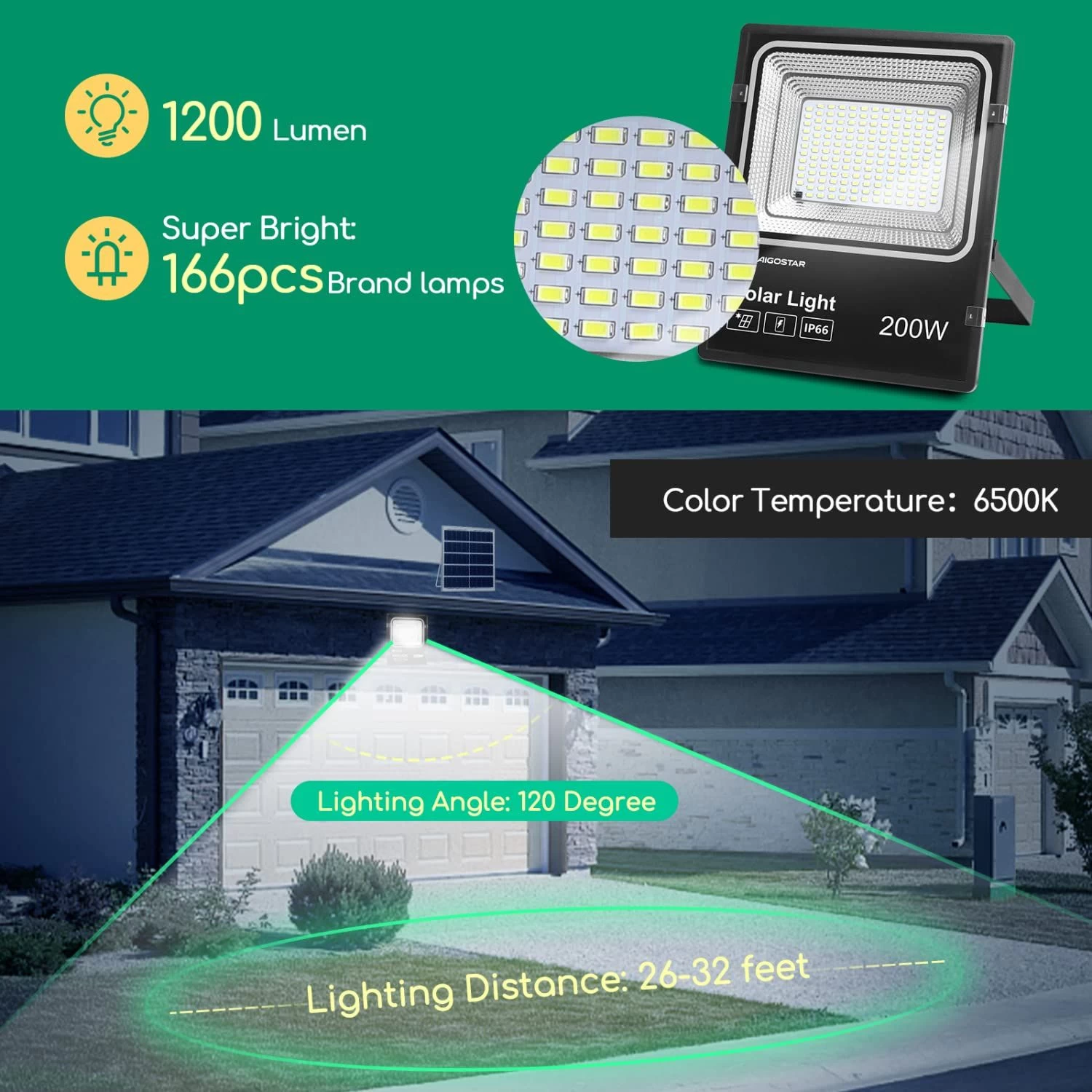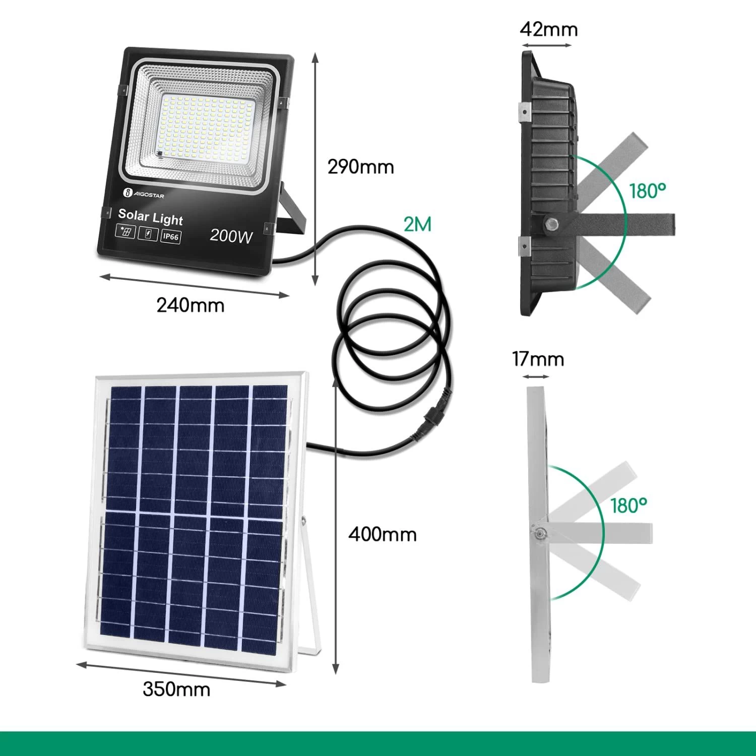 【panel solar de alta eficiencia 】el panel solar fotoeléctrico es de alta eficiencia, transforma hasta el 25% de energía solar en energía eléctrica y su batería de iones de litio de 15ah, permitirá que funcione durante 13 horas consecutivas si se carga por completo.【carga con poca luz】 este panel fotovoltaico aigostar está hecho de silicio monocristalino, que tiene un buen rendimiento con poca luz, alta tasa de conversión. Se puede cargar con poca luz en días de nieve y lluvia. Es ecológico y ahorra factura de electricidad.【tecnología led 】sus 166 luces led con chip mejorado, proporcionan una iluminación blanca fría de 6500 kelvin y una luminosidad de hasta 1200 lúmenes para iluminar cualquier rincón sin necesidad de gastos extras en la factura de la luz.【funcionamiento automático 】el foco dispone de un sensor tanto de amanecer como de anochecer lo que permite su encendido automático de noche y apagado durante el día, sin tener que programarla o preocuparse. También puede controlar el encendido/apagado y el temporizador con el mando a distancia.alcance del mando a distancia:10 m.【protección ip66】su protección ip66 garantiza que a lámpara es resistente al polvo, al viento y a el agua ya que está sellada herméticamente, por lo que resistirá perfectamente las inclemencias meteorológicas que se dan durante el uso en el exterior.