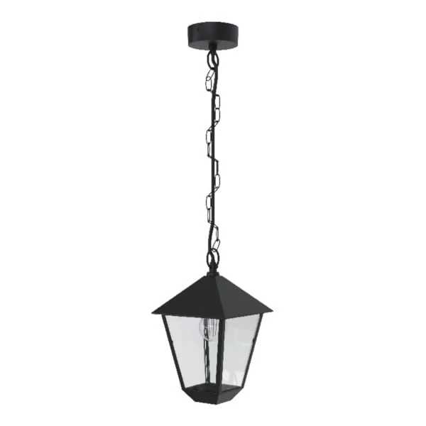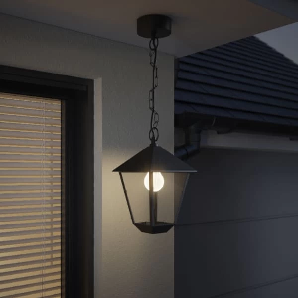 Luz exterior decorativa colgante. De estilo tradicional en forma de farol y acabado en color negro para dar a tu espacio un toque más actual. Necesita una bombilla E27 máximo 25W, no incluida, puedes encontrar en nuestra sección de iluminación distintos tipos de bombillas para elegir el color de la luz adecuado para el espacio a iluminar. Apto para el montaje en techo en áreas exteriores. Cable ajustable: 320 mm-520 mm.