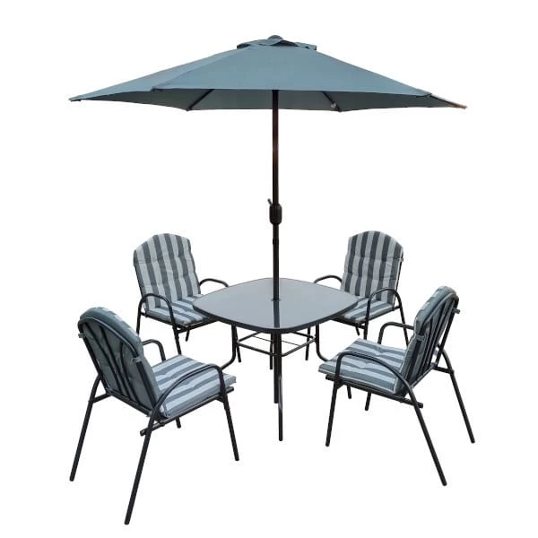 | Compuesto por | 4 sillas con cojines, parasol y mesa. Mesa con cristal de 5 mm y agujero para sombrilla. Con parrilla inferior de refuerzo y apoyo. Parasol de 6 varillas con manivela de ajuste. |