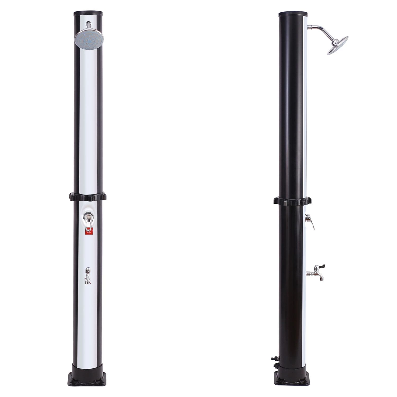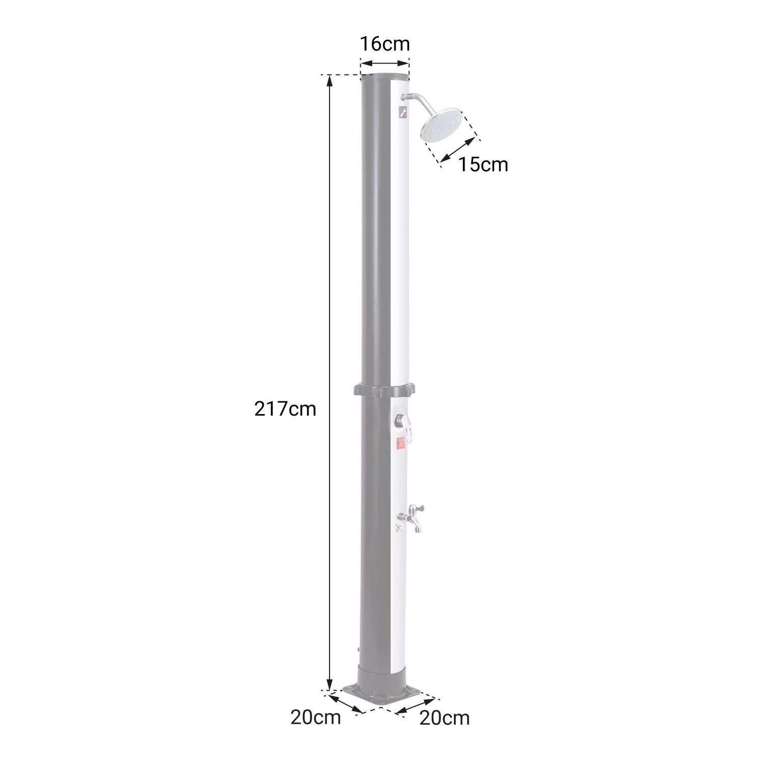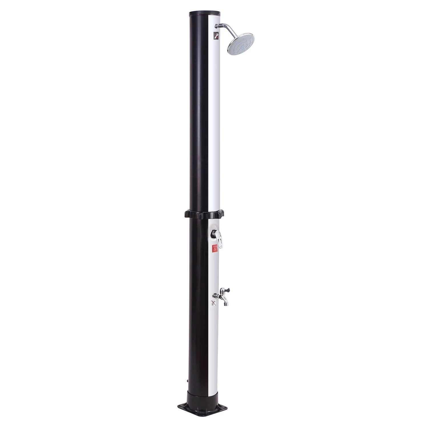descripción :tomar una ducha caliente en su jardín mientras preserva el medio ambiente y ahorra dinero ahora es posible gracias a la ducha solar fidgi. El agua se calienta naturalmente gracias al tanque de pvc que captura la energía solar. La instalación es sencilla y rápida: acople la ducha al suelo y suminístrele agua con una manguera de jardín. Y si desea lavarse sólo los pies, la ducha solar fidgi tiene un enjuague para los pies en la parte inferior de su columna.detalles del producto :dimensiones :- ducha : al 217 × ø16cm- base : l 20 × an 20 × esp. 0,5 cm- diámetro del rociador : ø 15cm- altura mezclador : al 100cm- altura de enjuague de pies : al 60cmmateriales :- estructura : pvc- rociador : abs (plástico)- manguera : pvc- mezclador : aleación de zinc- enjuague de pie : abs (plástico)colores :- estructura : color negro y platainformaciones complementarias :- capacidad : 35l- temperatura máxima del agua : 60°c- presión máxima del agua : 3,5 bar- sistema de fijación incluido- sin montar (instrucciones incluidas)- garantía : 3 añosentrega :la ducha solar fidgi 35l contiene : 1 duchaentrega a pie de calle – entrega en 1 paquetepaquete 1 : l 120 × an 44 × al 26cm – peso bruto: 11,4kg / peso neto: 9,5kg