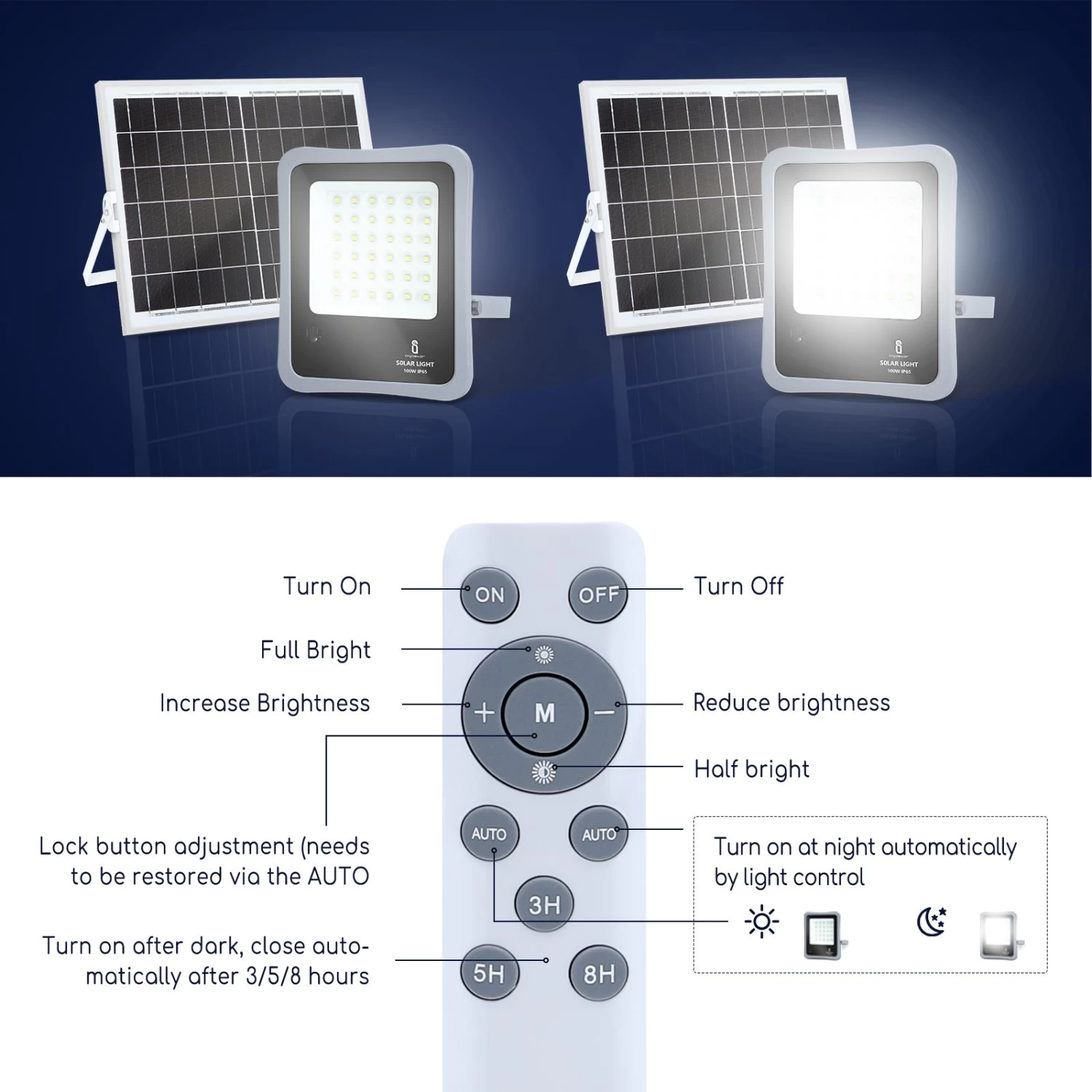 【funcionamiento automático】 el foco dispone de un sensor tanto de amanecer como de anochecer lo que permite su encendido automático de noche y apagado durante el día, sin tener que programarla o preocuparse. También puede controlar el encendido/apagado y el temporizador con el mando a distancia.