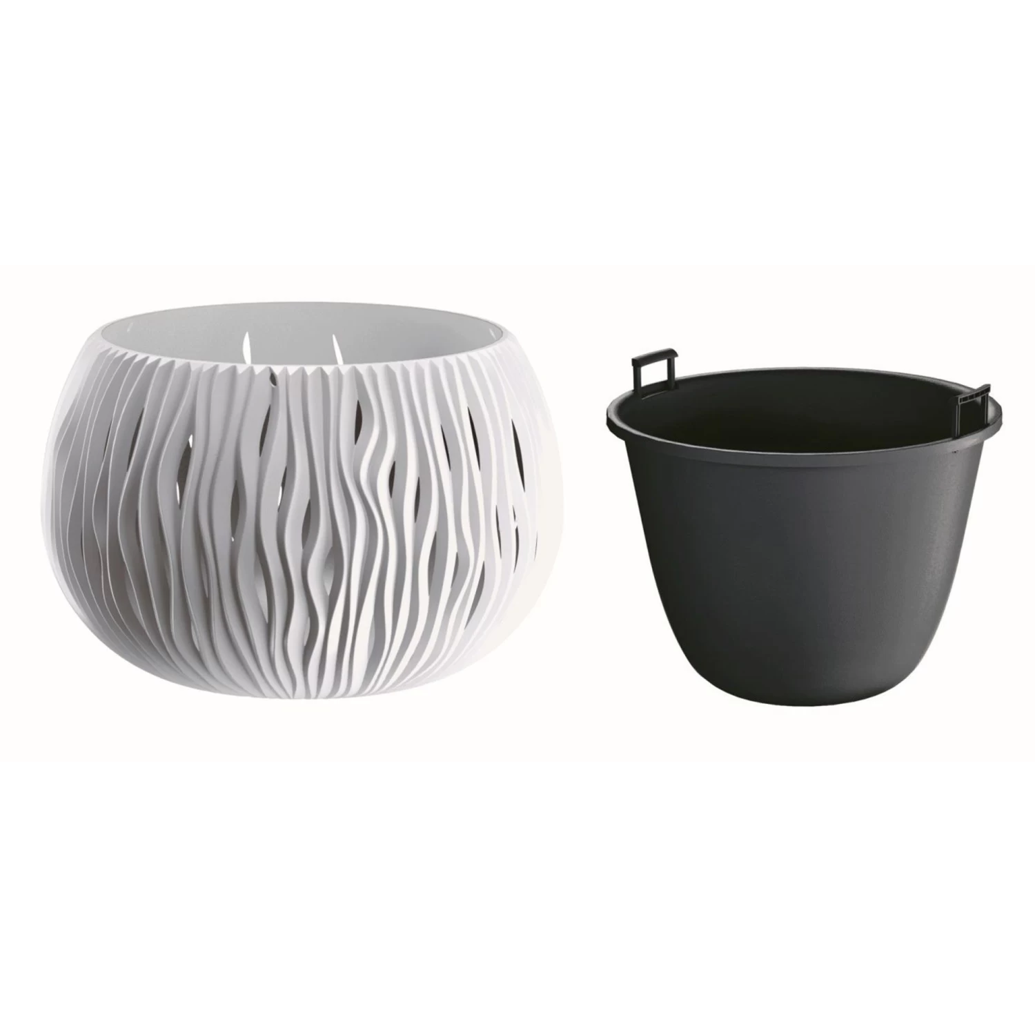 Macetero de dos piezas (macetero y depósito interior para la tierra o grava), de la colección bowl sandy en nuevas dimensiones. Da tanto juego que uno que no emplees como macetero, te ofrece una decorativa mesita.