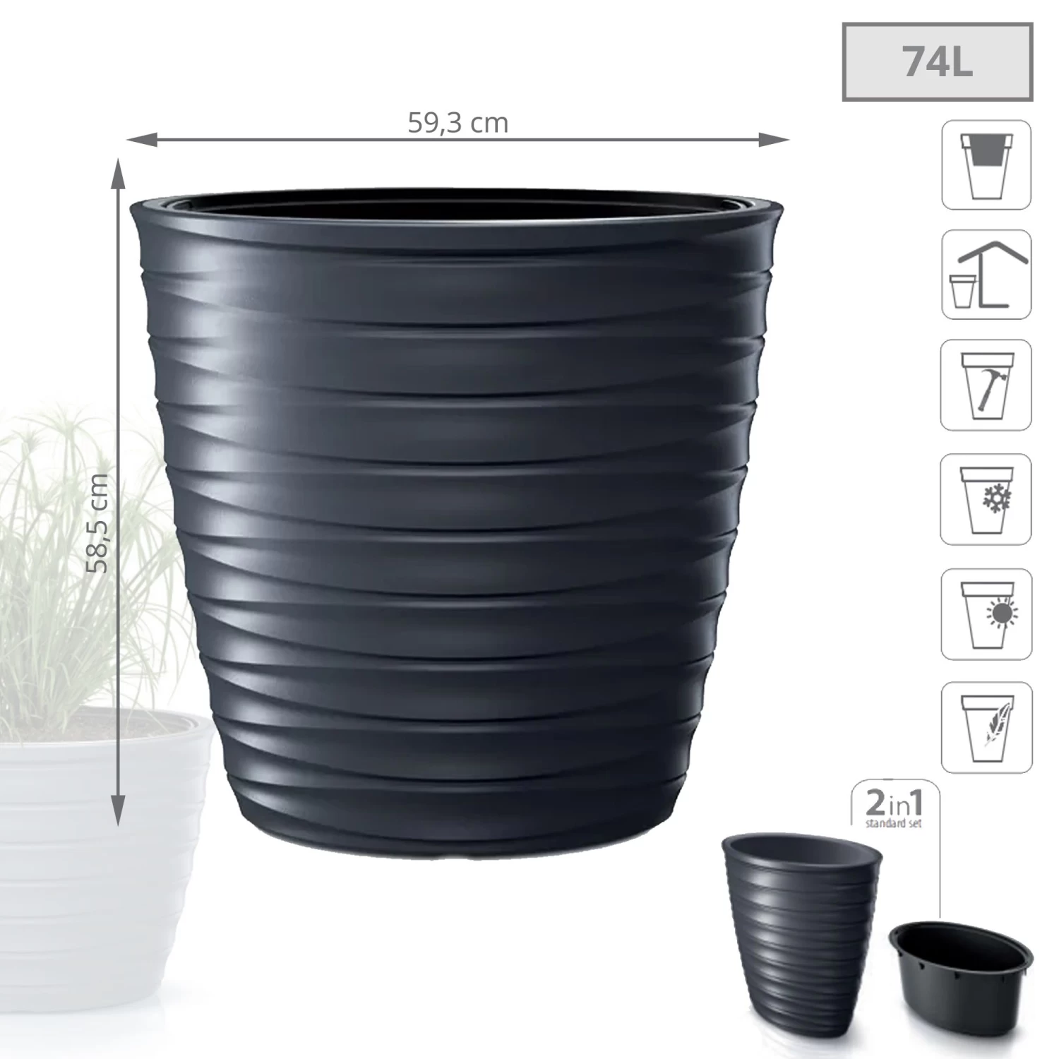 Set 2 en 1: macetero que incluye un depósito interior adaptado que reduce la cantidad de tierra necesaria.