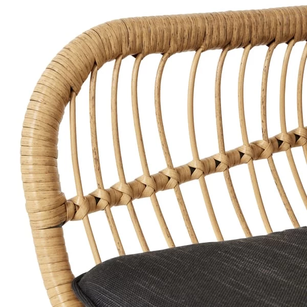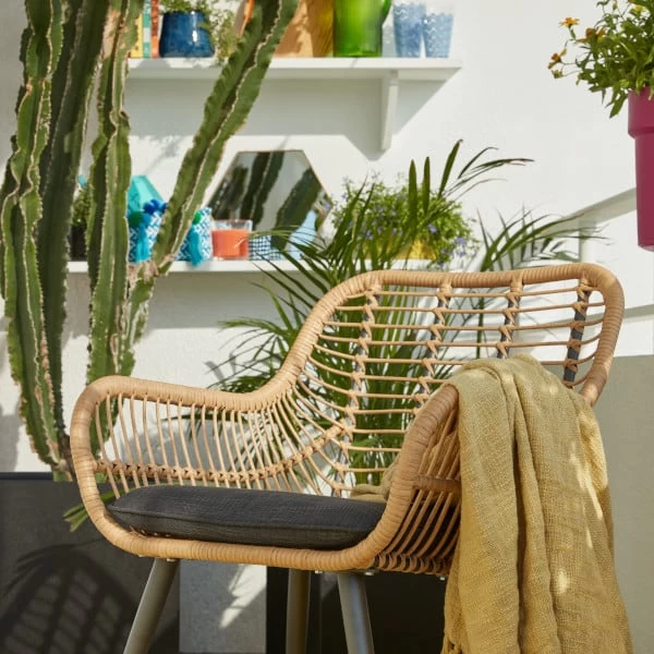 Este sillón de líneas curvas y un color natural es perfecto para crear una atmósfera cálida y agradable en el jardín, terraza o balcón. Recomendamos complementar con la mesa auxiliar Nova y la gama de ratán Apolima.